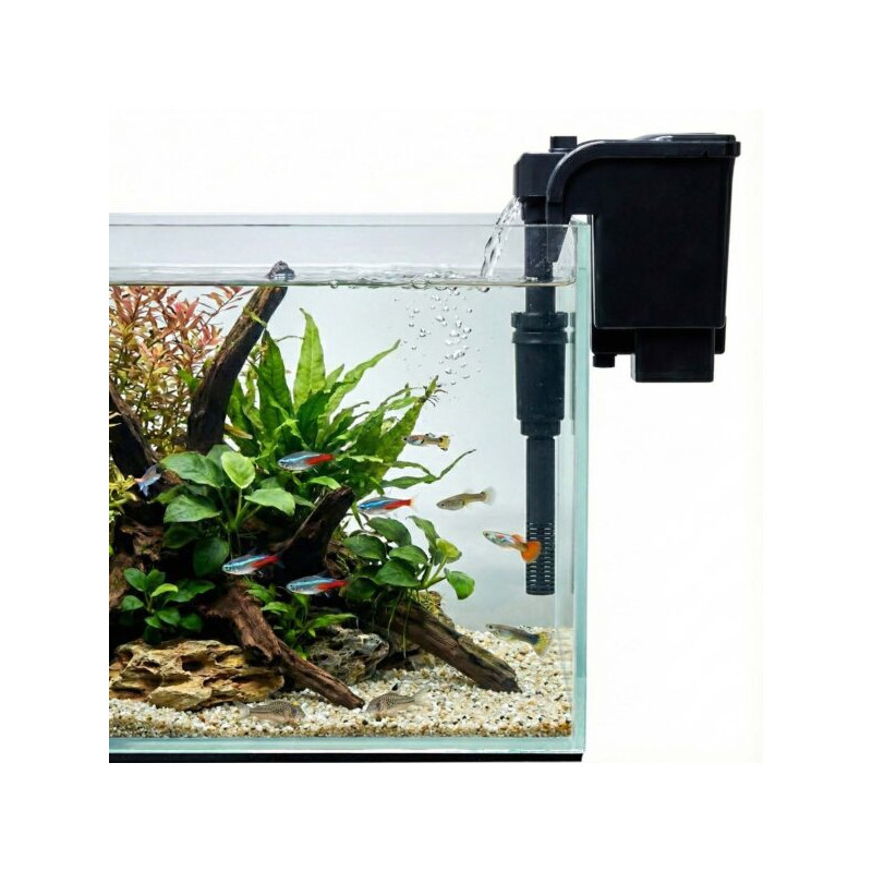 Compacto y silencioso. Su diseño colgante libera espacio dentro del acuario, permite ajustar el caudal y facilita el mantenimiento. Ideal para acuarios de agua dulce y marinos, acuarios plantados y aquaterrarios.