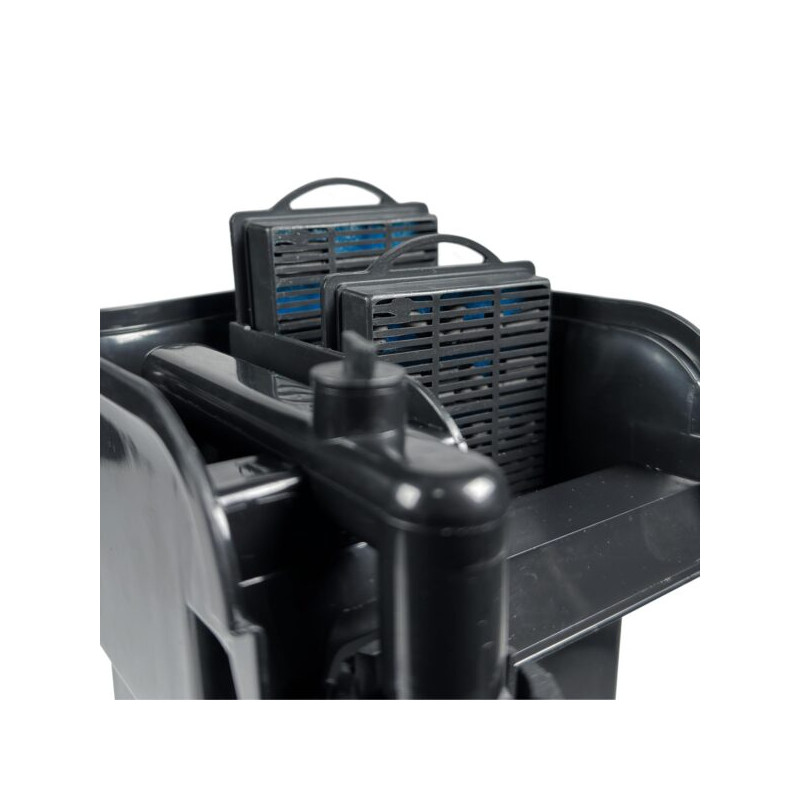Sistema de filtración multi etapa de 2 cartuchos intercambiables con fibra sintética de alta densidad y carbón activo. Permite personalizar el material filtrante que necesite su acuario.