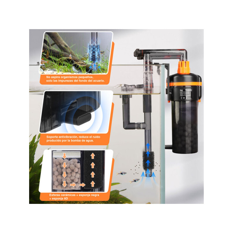 El filtro externo colgable Hang On Back Hygger es un sistema de filtración avanzado y compacto, diseñado para adaptarse perfectamente a acuarios tanto de agua dulce como salada. Destaca por su funcionamiento silencioso (menos de 30 dB) gracias a su diseño hermético y su motor interno que minimiza vibraciones. Ofrece una filtración completa en tres etapas: mecánica, química y biológica.El agua sucia entra al filtro mediante el tubo de aspiración, mientras que una parte es absorbida por su skimmer de superficie. Luego, el agua pasa a la cámara de filtración, donde atraviesa tres etapas de medios filtrantes. Finalmente, el agua limpia se expulsa a través de la tubería de salida.