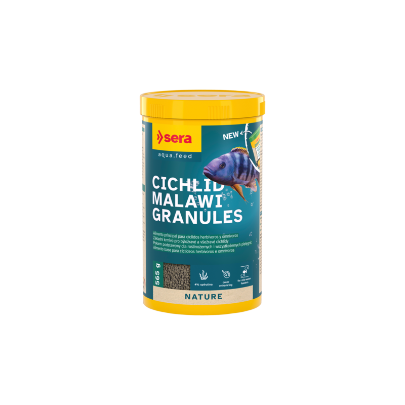 Cichlid Malawi Granules es el alimento principal a base de granulado cuidadosamente elaborado, sin colorantes ni conservantes, para cíclidos pequeños que se alimentan principalmente de plantas y de algas. Entre ellos se cuentan muchas especies de cíclidos de África oriental.