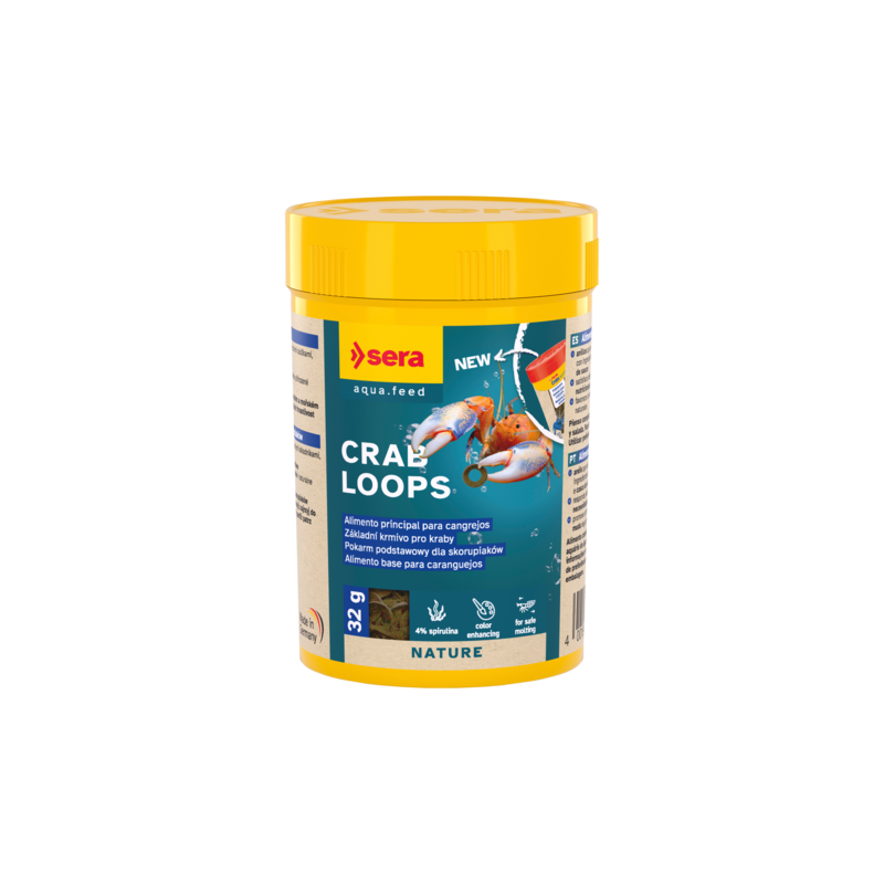 El alimento para cangrejos de sera también está especialmente adaptado a las necesidades de estos animales. En la naturaleza, la mayoría de las especies de cangrejos de río (p. ej., Astacus, Cherax, Procambarus), pero también muchos otros cangrejos (p. ej., cangrejos de manglar) se alimentan principalmente de hojas caídas y otros materiales orgánicos, como la carroña. Sin embargo, los organismos acuáticos, como las larvas de insectos, gammarus y caracoles acuáticos, también suelen formar parte de su alimentación. Por tanto, el alimento principal para cangrejos contiene ingredientes de alta calidad, tanto de origen vegetal como animal.