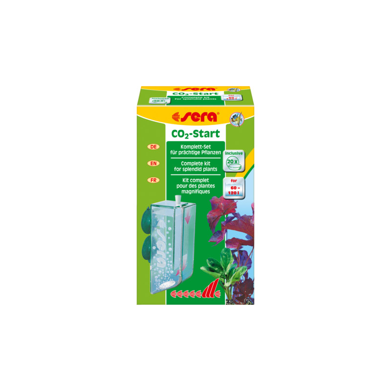 Para los populares acuarios pequeños de hasta aprox. 120 litros, resulta idóneo el sistema de abonado con CO2 sera CO2-Start, que es barato y de fácil instalación y manejo. El sera CO2-Start se compone del sera reactor de difusión de CO2, pequeño, discreto y fácil de disimular con plantas u objetos decorativos, y las sera CO2-Tabs plus correspondientes.