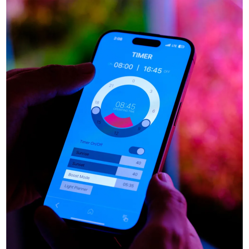 Control de aplicación intuitivo : ajuste de espectro completo, modo Boost, simulación de amanecer y atardecer, planificador de luz de 25 días y temporizadores precisos.